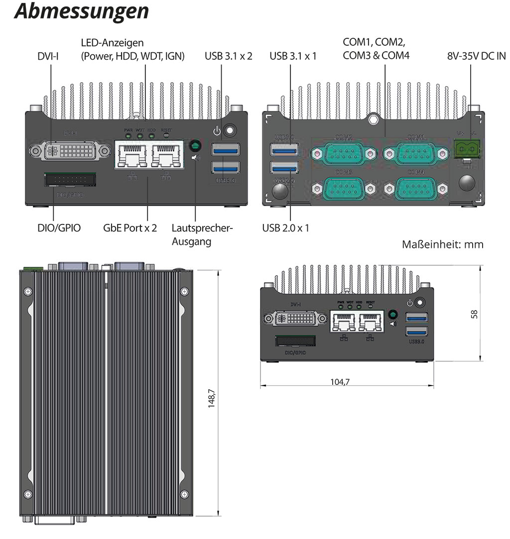 | Leistungsaufnahme | Intel® Atom™ E3845, 4GB RAM und 1x SSD: max. ca. 20W |